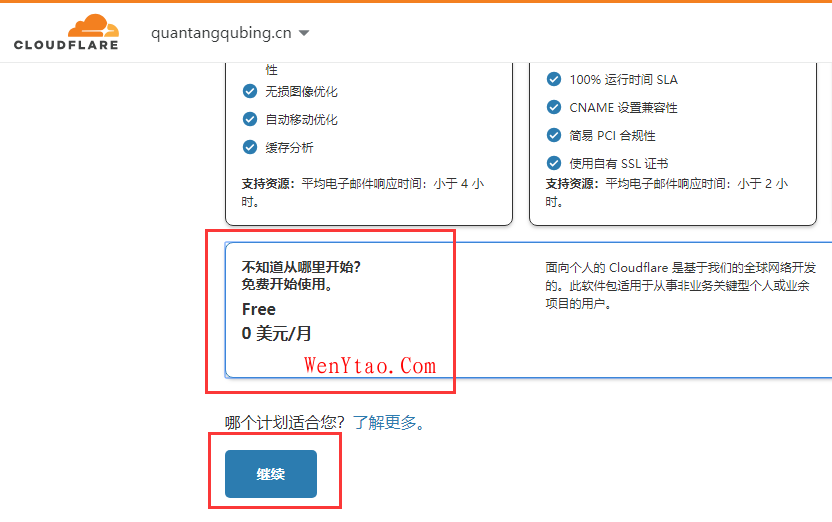 点击添加,稍等片刻会提示让您选择套餐,服务不同价格不等,我们这里往下看,找到免费版,点击选择,继续,如图: