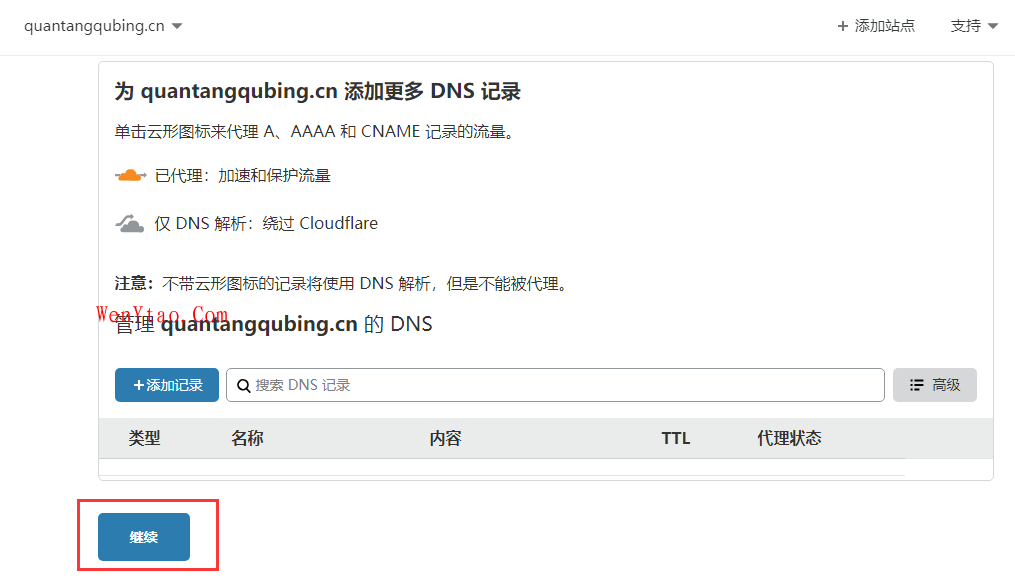 系统会自动扫描DNS记录,因为我这个域名是新注册的,所以没有记录,然后在点击继续。