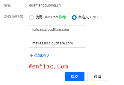 点击自定义DNS,添加cloudflare网站的DNS,如图: