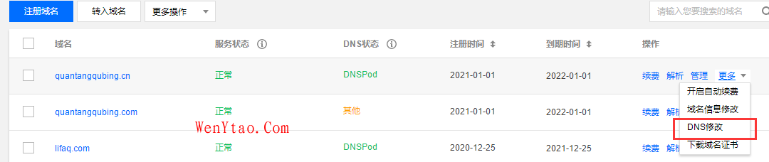 我们需要把域名的DNS换成Cloudflare的,以dnspod为例,进去DNSPOD,点击右侧更多-DNS修改,如图: