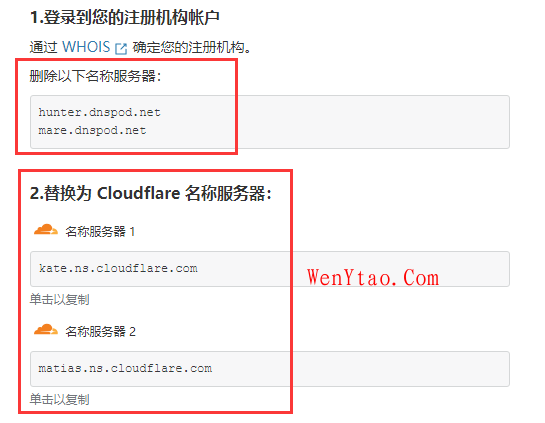 系统会提示,让我们删除域名目前所设置的DNS解析,更改成Cloudflare所给出的DNS。