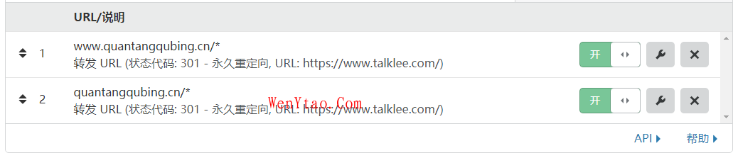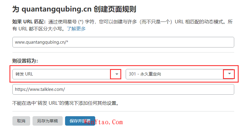 www.quantangqubing.cn/* 则设置将为:转发URL,类型选择301永久重定向目标地址设置为“https://www.talklee.com/”换成您想转发的链接即可,点击保存并部署,如图所示说明成功了。