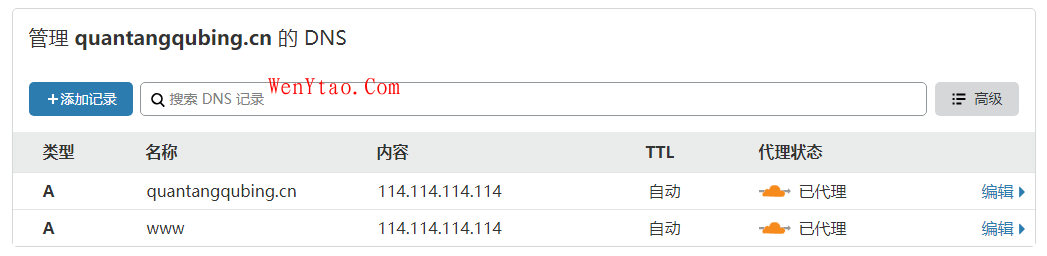类型选择A,名称分别设置@和www(这是两个记录),IPv4地址随便设置,没有意义反正都得去跳转,其他默认,点击底部保存,如图: